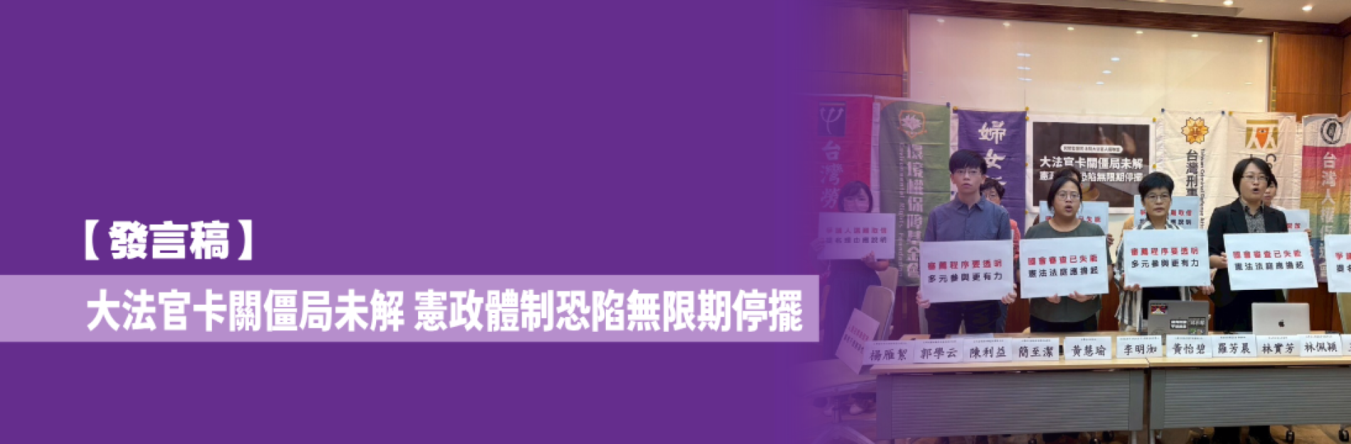 2025年9月17日,民間監督司法院大法官人選聯盟召開「 大法官卡關僵局未解 憲政體制恐陷無限期停擺 」記者會,共11個聯盟夥伴團體出席,指出憲法法庭已經癱瘓235天。 ・為維持憲政體制的正常運作,聯盟夥伴共同發表三點聲明: 1...
