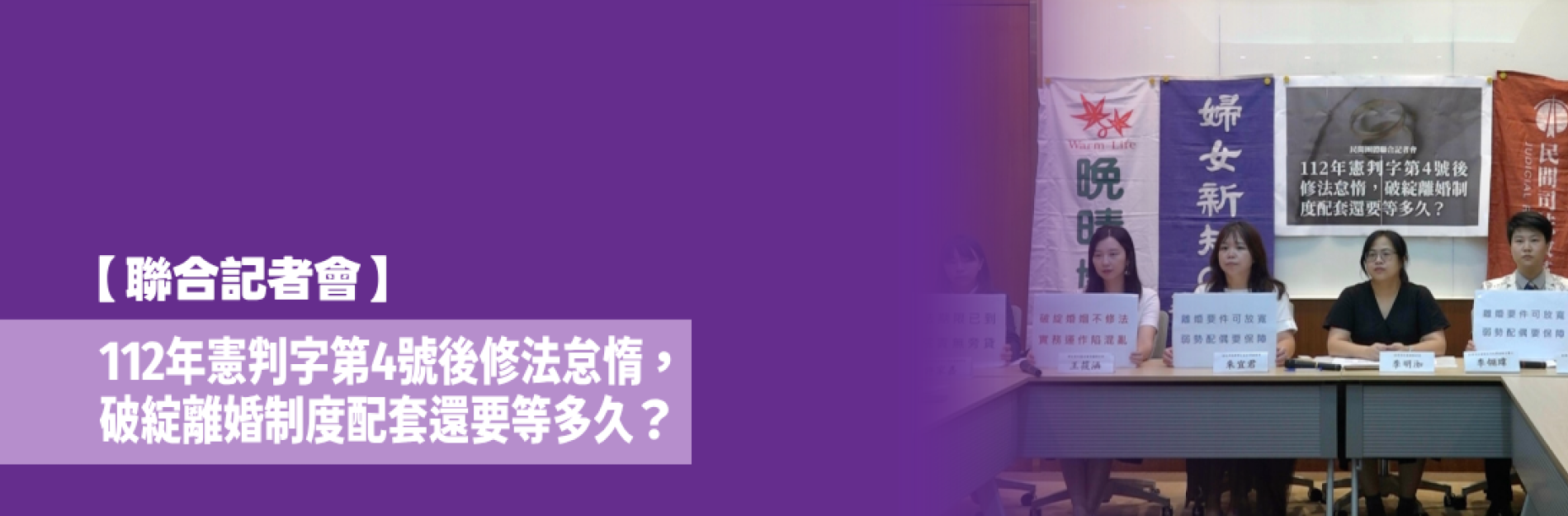 在立法院新會期前夕, 婦女新知基金會在 8/29與 民間司法改革基金會 及 台北市晚晴婦女協會 舉辦聯合記者會「112年憲判字第4號後修法怠惰 破綻離婚制度配套還要等多久?」 ,...