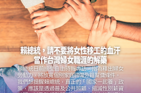【聲明】賴總統,請不要將女性移工的血汗,當作台灣婦女職涯的解藥