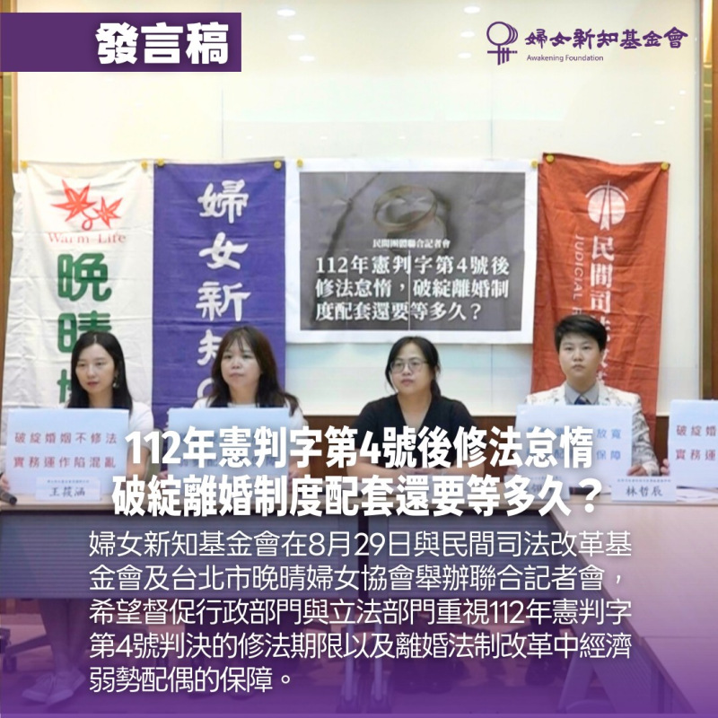 在立法院新會期前夕,婦女新知基金會在8/29與 民間司法改革基金會 及 台北市晚晴婦女協會 舉辦聯合記者會「112年憲判字第4號後修法怠惰 破綻離婚制度配套還要等多久?」,希望督促行政部門與立法部門重視112年憲判字第4號判決的修法期限以及離婚法制改革中經濟弱勢配偶的保障。