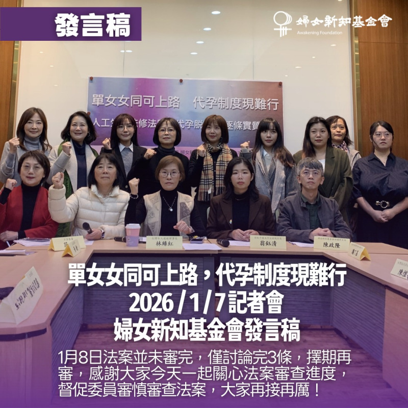 【人工生殖法修法應與代理孕母脫鉤並逐條實質審查記者會】婦女新知基金會發言稿
